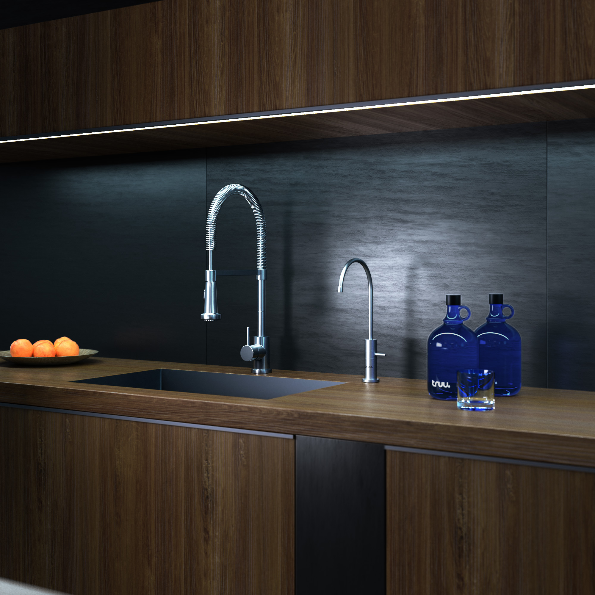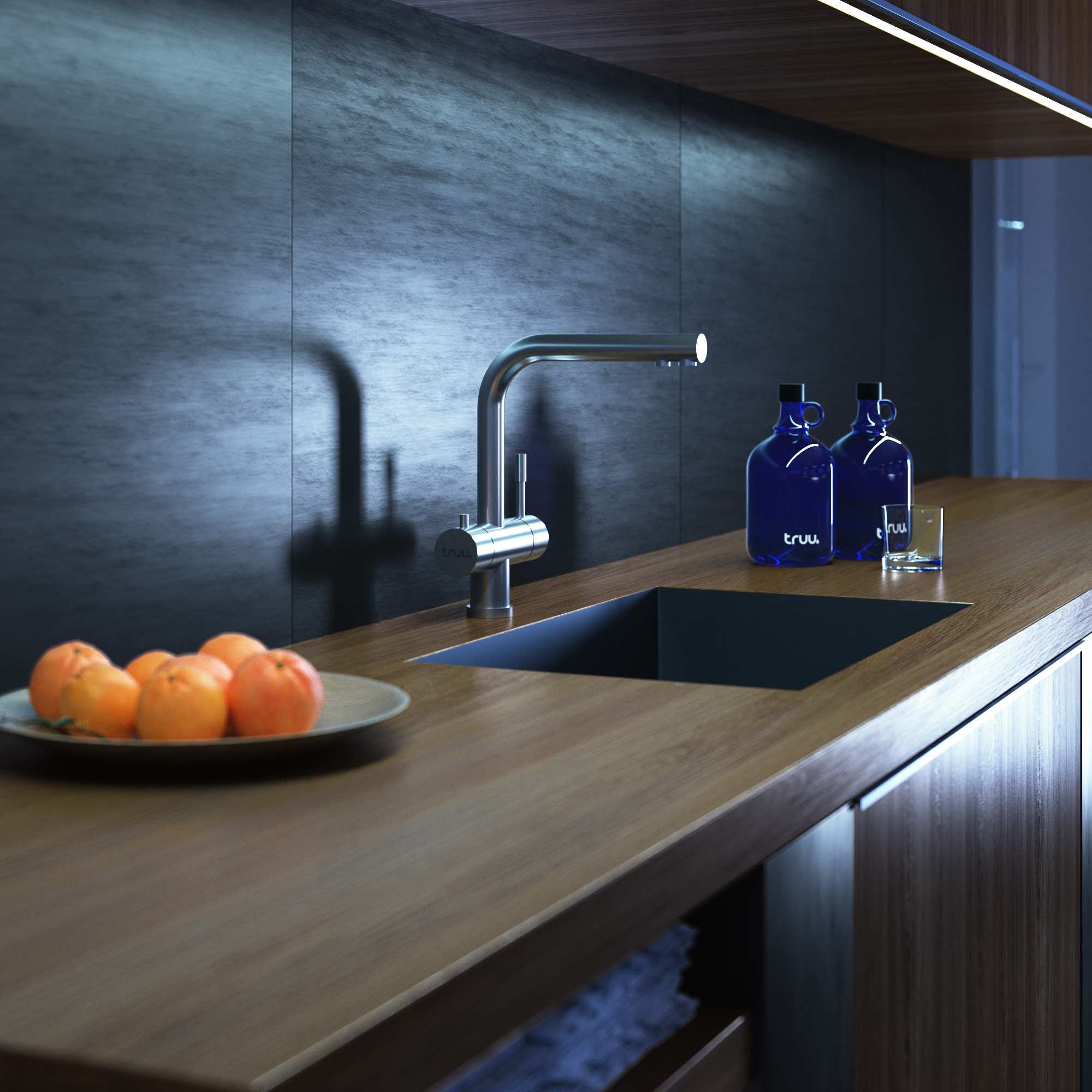 Die schwenkbare Misch-Armatur truu trio ist gegen Aufpreis erhältlich und bietet zwei getrennte Wasserläufe: Leitungswasser und truu original water, das bis zuletzt durch chirurgischen Edelstahl fließt. Installation über vorhandene Armaturenbohrung möglich. Auch als Niederdruck-Version verfügbar.
