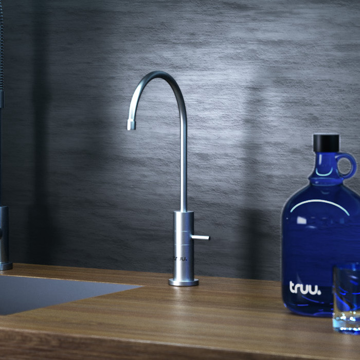 truu solo ist unser Standard-Edelstahlhahn. Du kannst aber gegen Aufpreis auf die hochwertige 3-Wege-Armatur truu trio upgraden. Bei beiden fließt dein truu original water bis zum Schluss durch chirurgischen Edelstahl. So bleibt es rein, bis ins Glas.